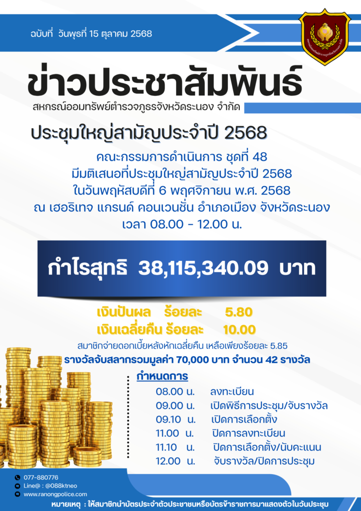 ขอเชิญประชุมใหญ่สามัญประจำปี 2568 ในวันที่ 6 พ.ย. 68